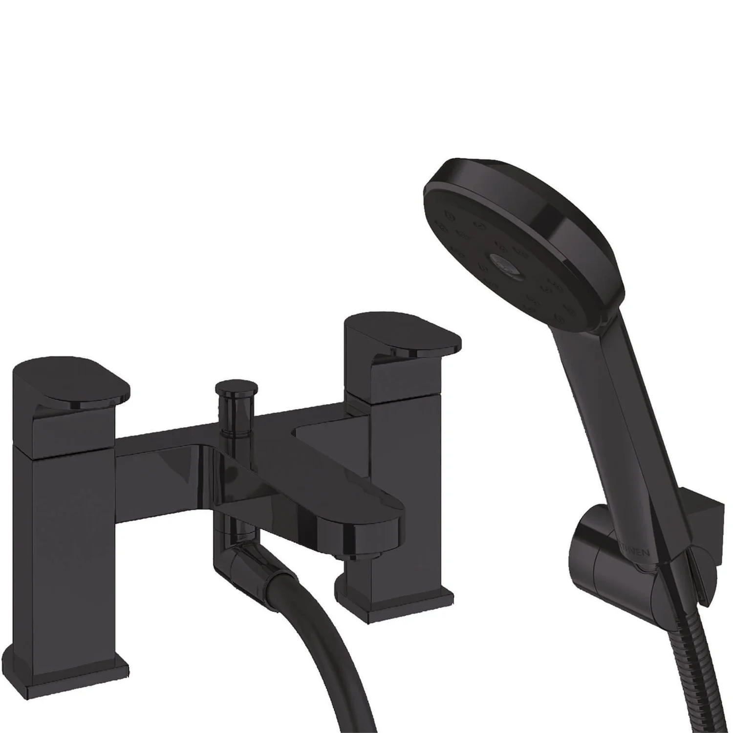 - Deck mounted two-hole, single outlet tap with a self-cancelling diverter to the shower outlet