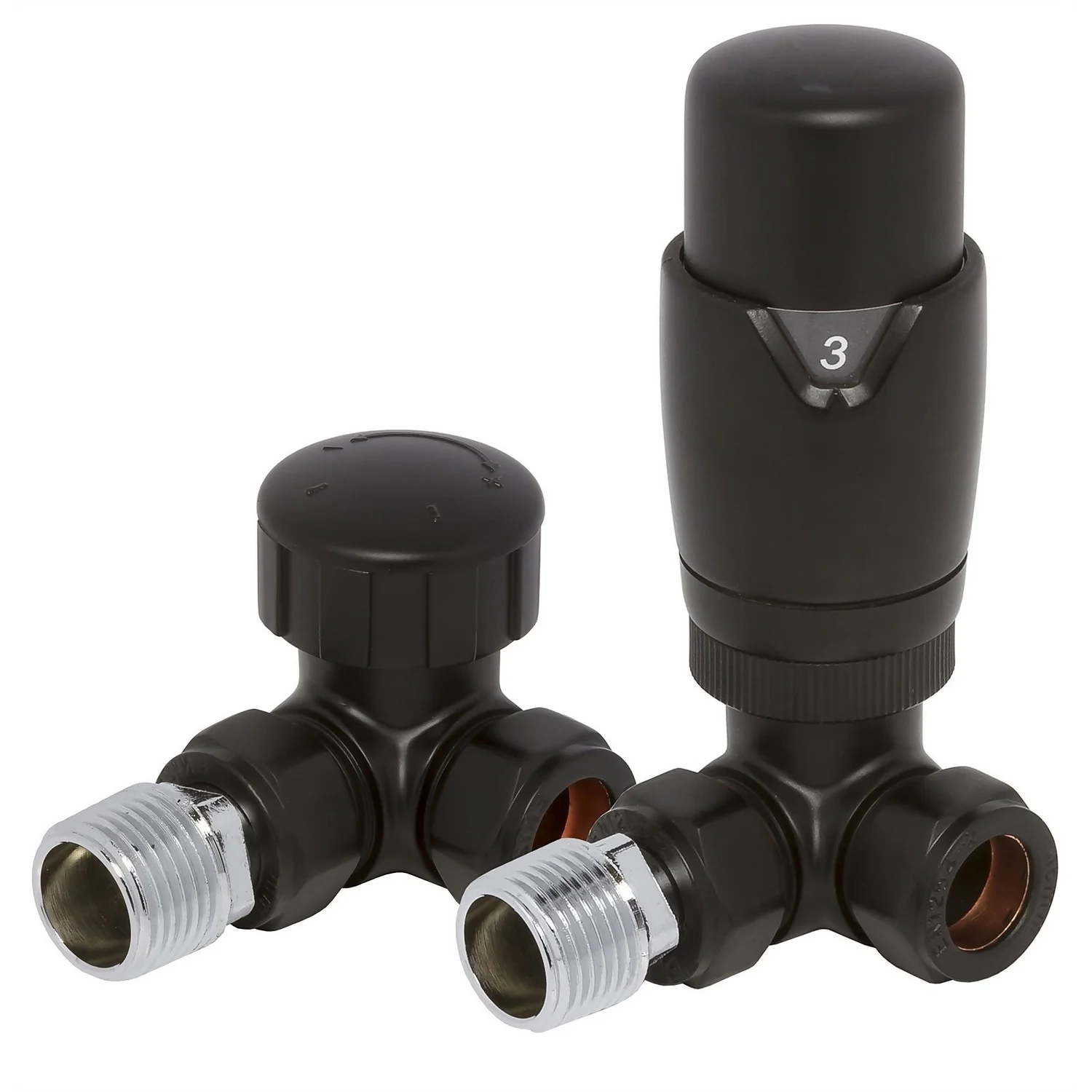 Black Corner Thermostatic Radiator Valve and Lockshield Set. The benefit of using Corner valves when pipe work is coming from the wall is that the radiator head will be pointing upwards and will not increase the overall depth of your radiator. Compliment your radiator.