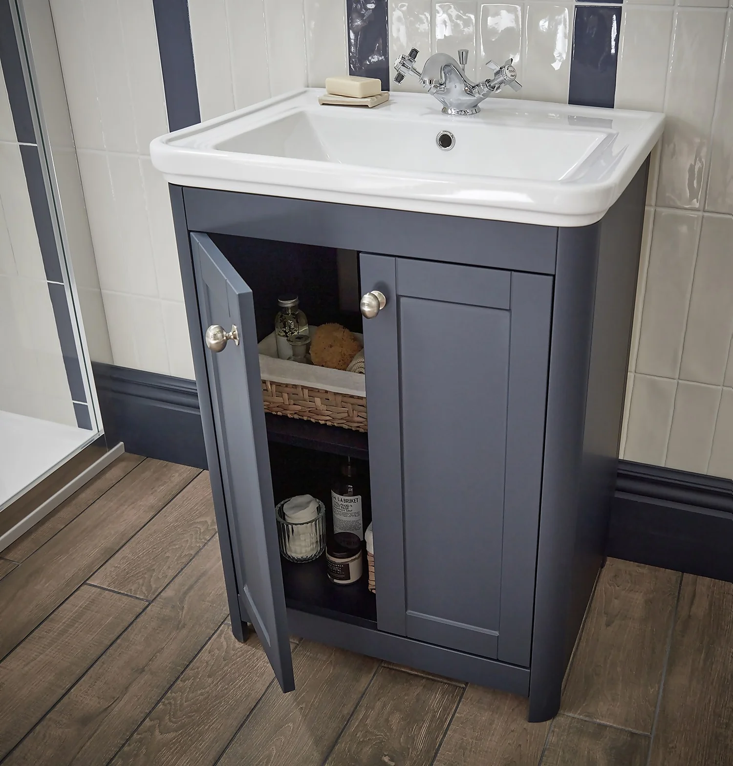 Bring the Navy bathroom trend to your home with our Country Living Wicklow Basin Unit. In a traditional shaker style, this luxurious and durable floor standing unit has beautiful curved edges and boasts soft close noise free hinges. The unit has ample storage with a fixed shelf for keeping all your toiletries and bathroom must-haves neatly stored away and your surfaces clutter free. Finished with brushed chrome oval handles to perfect the classic look. The finish on this unit has a warm wax like feel with a silky touch.The ceramic sink is included with the basin unit and oozes country charm with a modern twist.