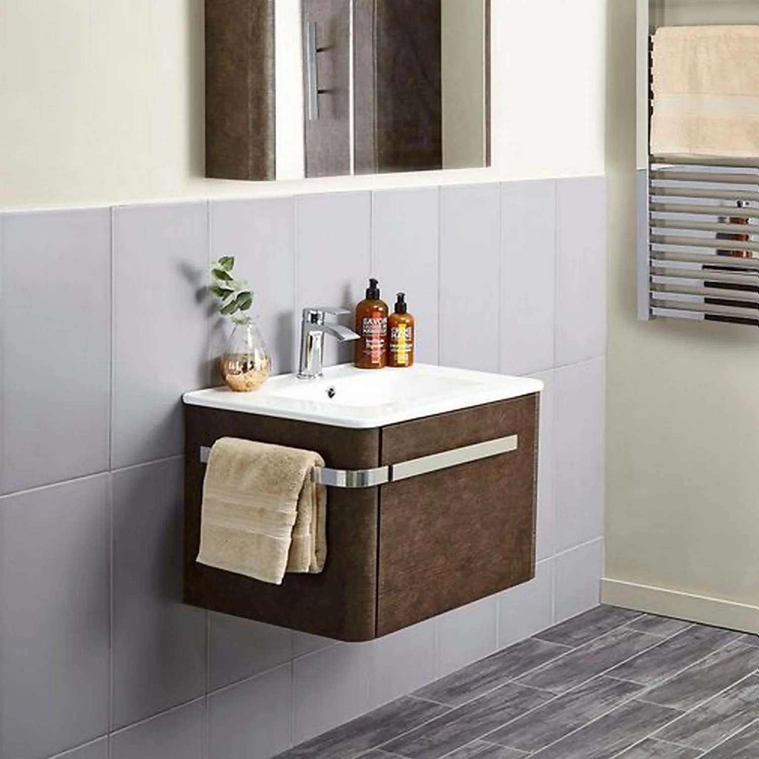 With a unique linen textured finish and integrated wraparound handle, this furniture collection stands out from the crowd. This wall hung vanity unit with a contemporary basin offers plenty of storage, and the beautiful clean lines give a modern and elegant look.Features and benefits
