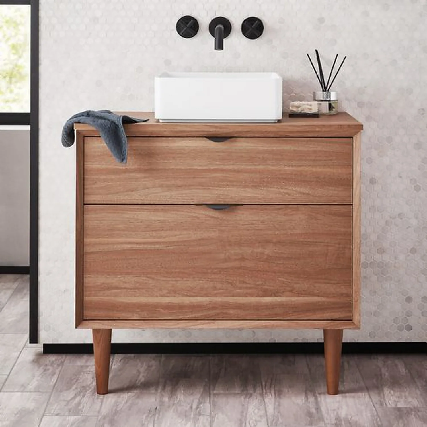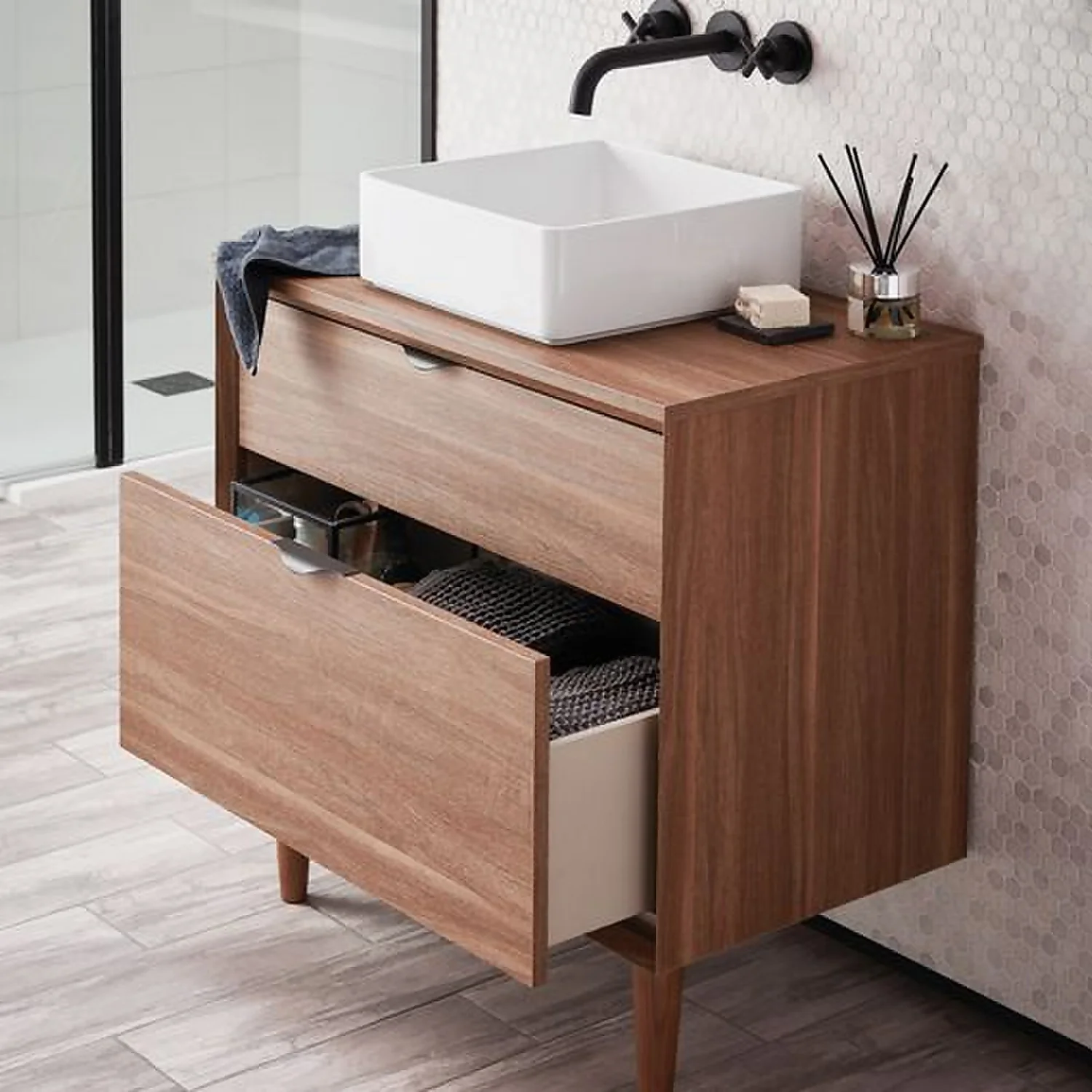 The Noir Craft 800mm Vanity Unit combines on-trend style with absolute practicality. Caramel wood, great storage and classic mid-century styled legs, makes this unit have a luxe bathroom appearance. As part of our Noir collection, it can also be combined or matched with other Noir products to create a stunning co-ordinated display.Worktop and basin not included – worktop can be purchased separately here