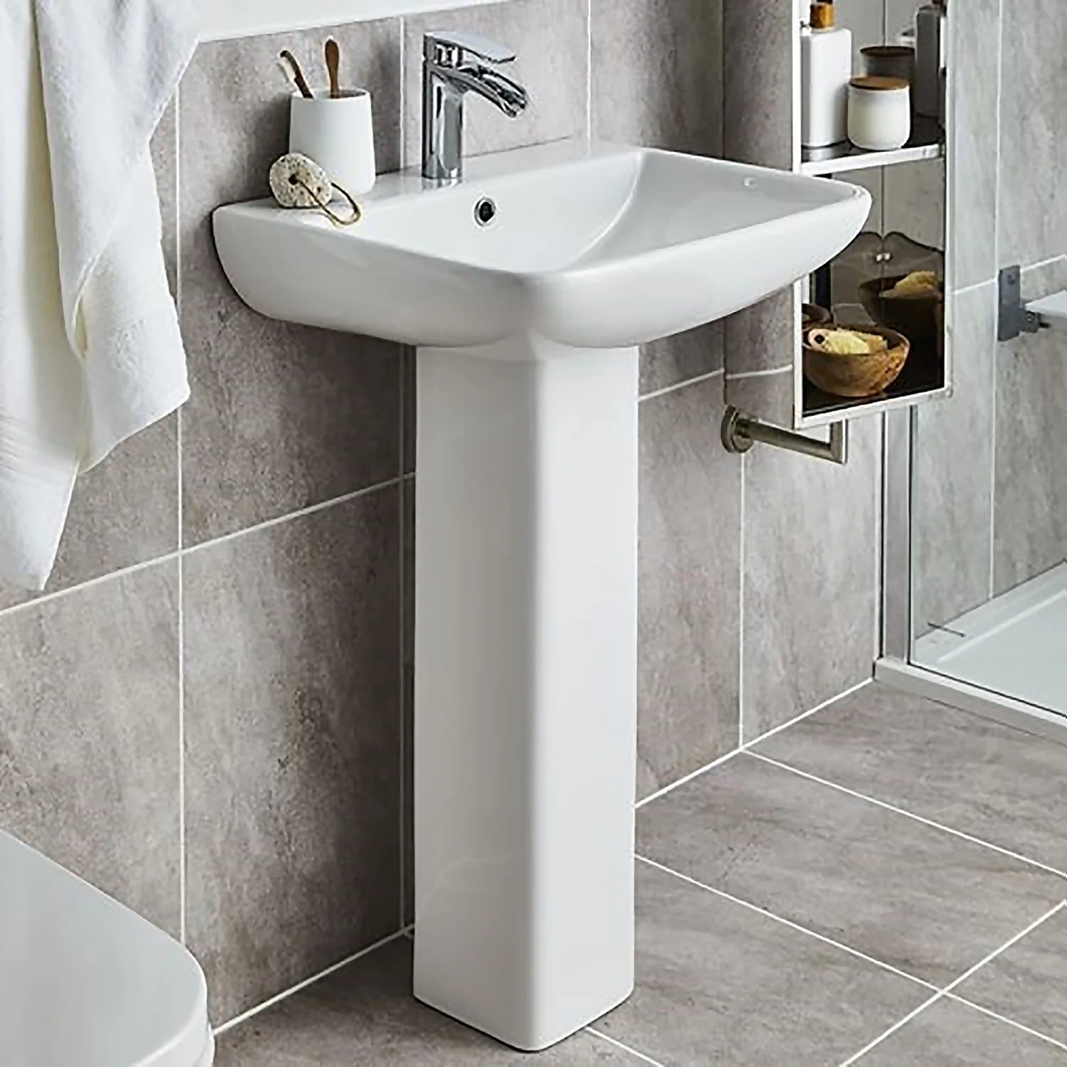 The Scene 550 basin and pedestal has a modern style and is very practical. It has a convenient tap ledge and a thinner rim, giving the basin a streamlined appearance.