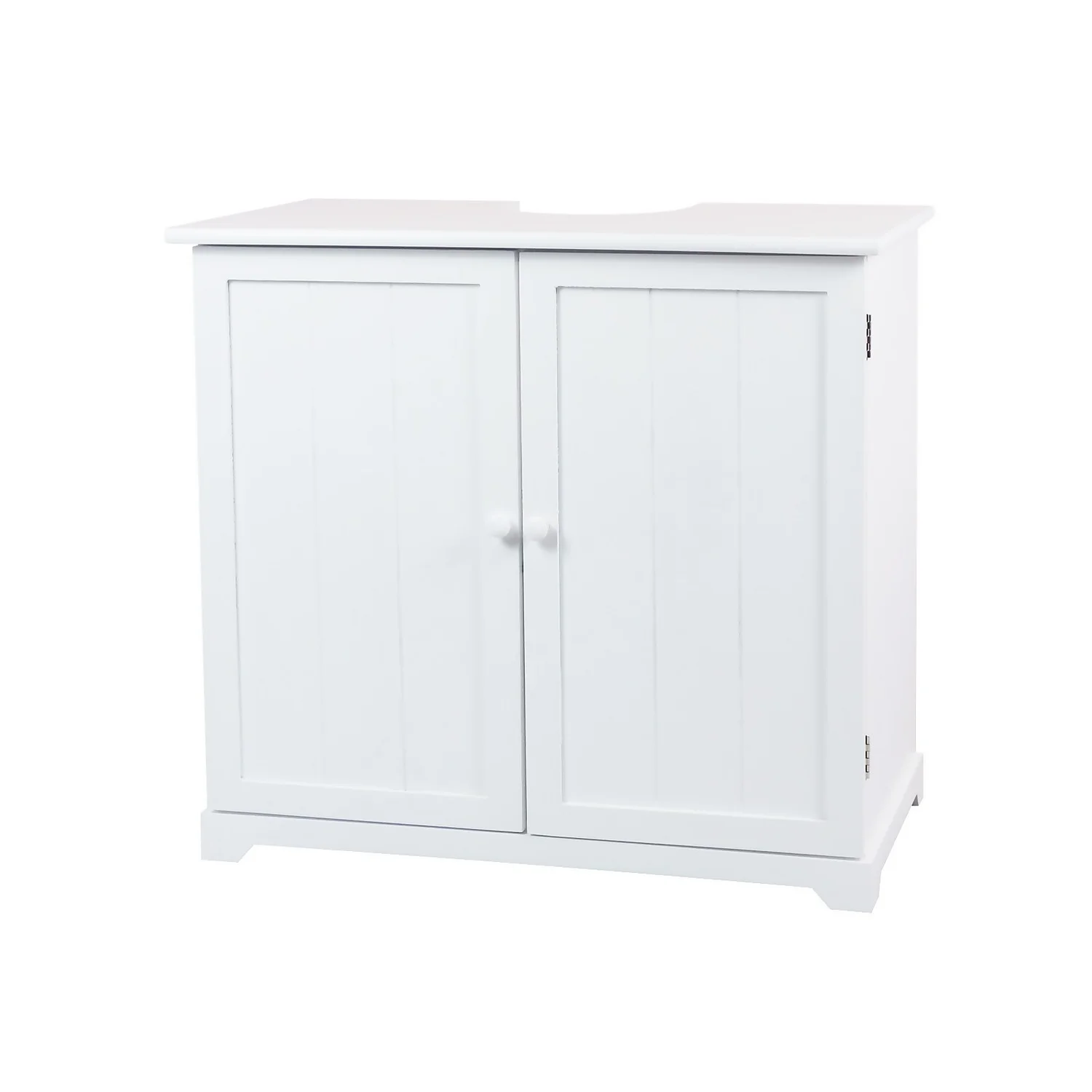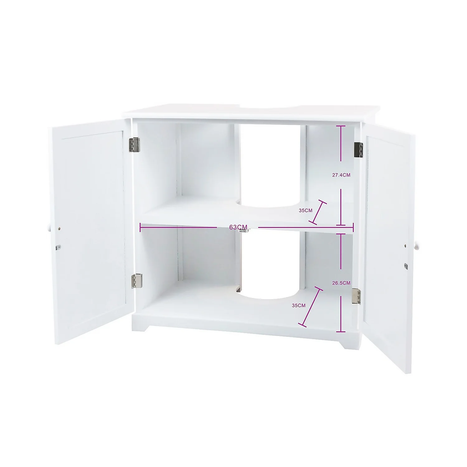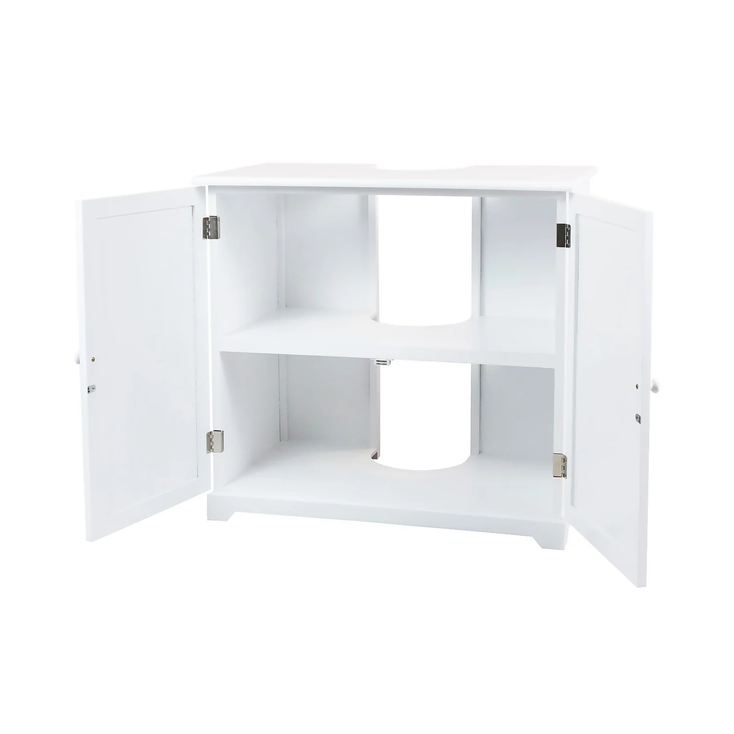 This freestanding under-basin storage unit in a contemporary white features an internal shelf and double doors.