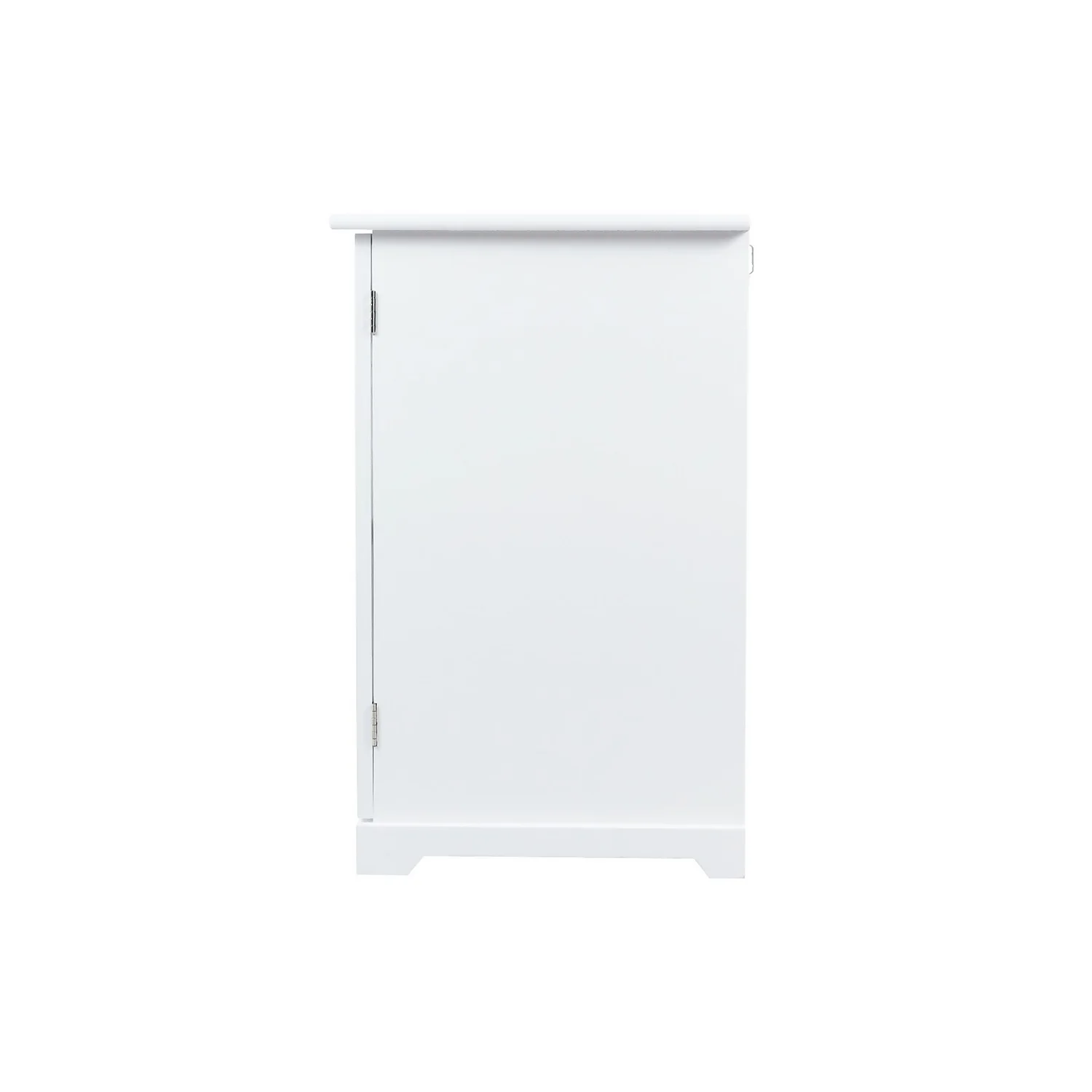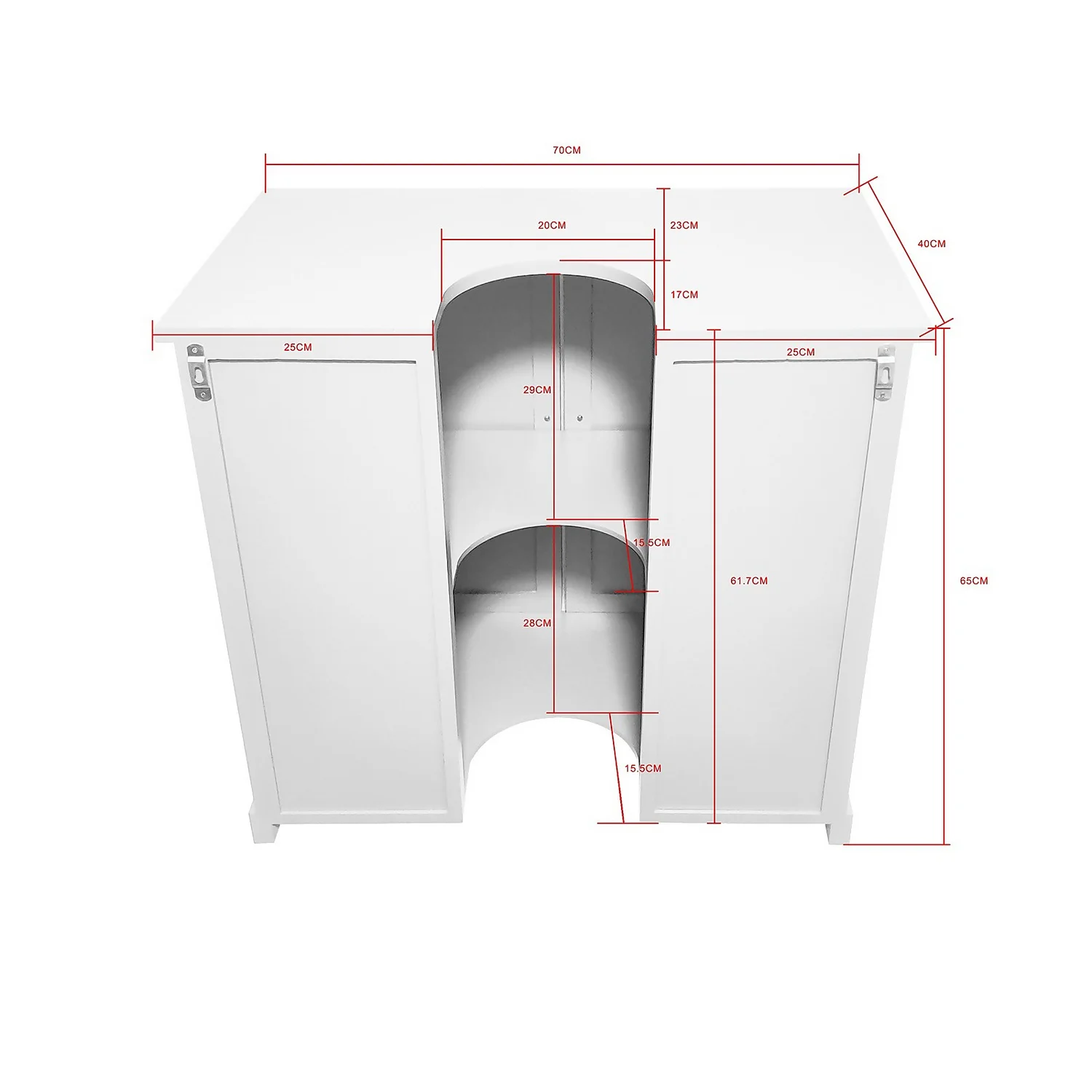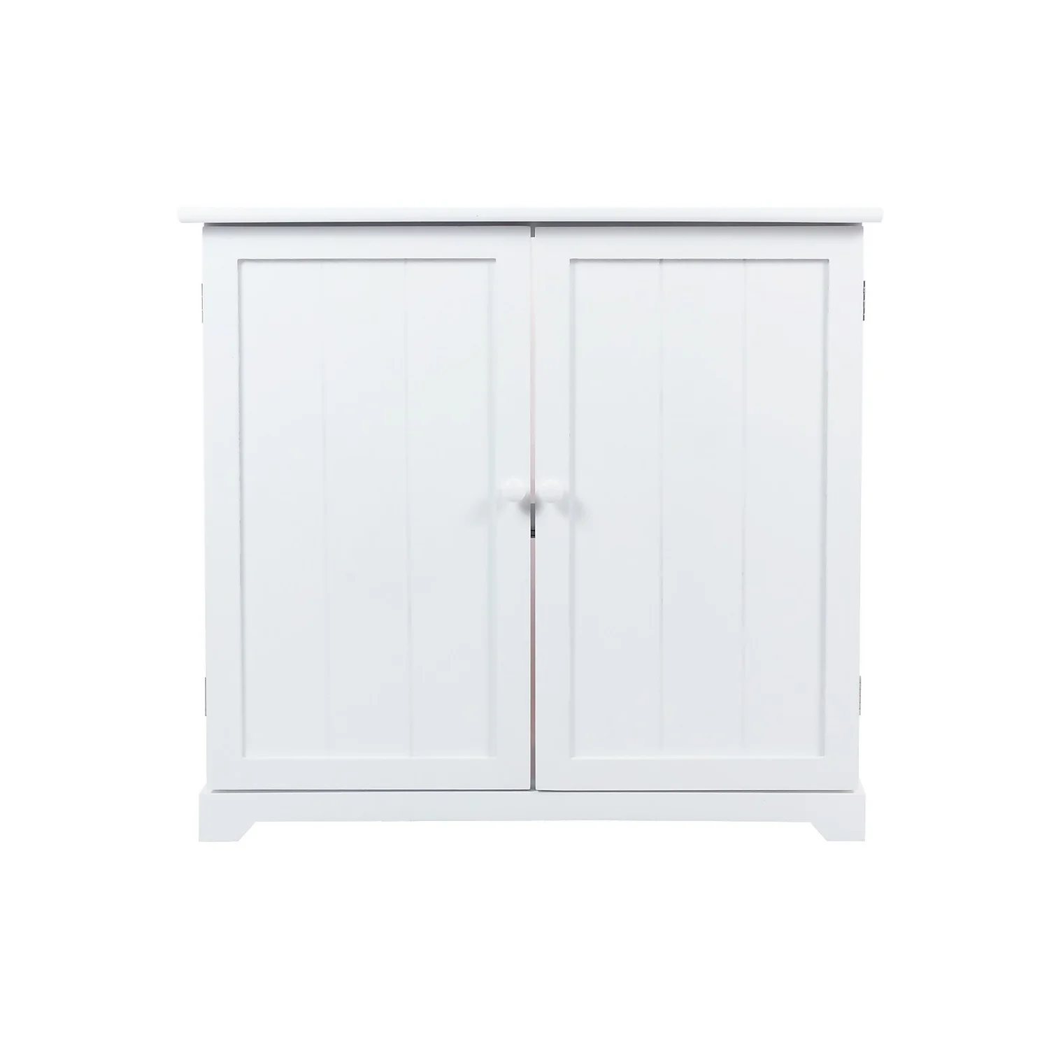 This freestanding under-basin storage unit in a contemporary white features an internal shelf and double doors.