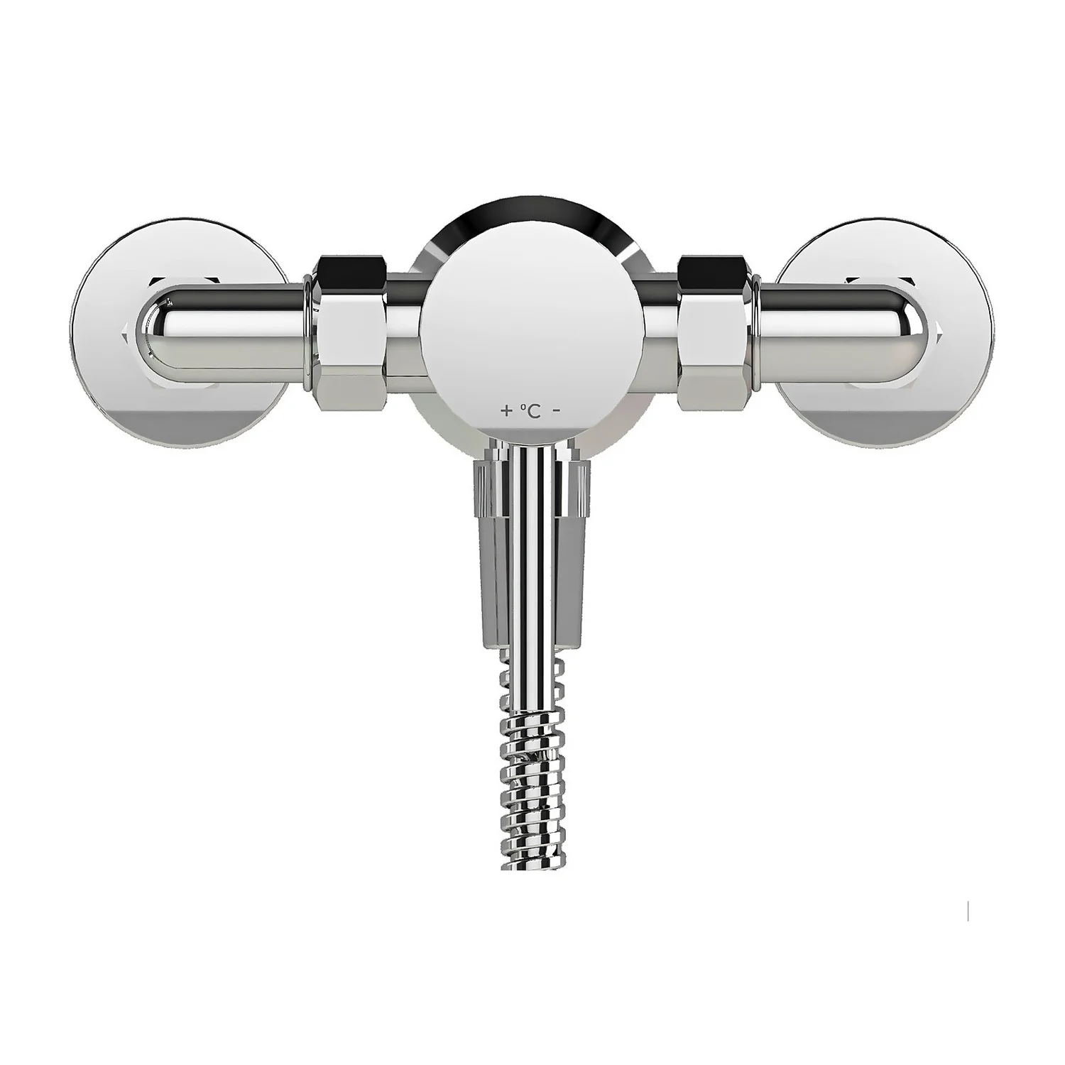 A single outlet, manually operated mixer valve with a single handle that turns the shower on and sequentially controls the water temperature. A refreshing shower experience is delivered from the single mode, rub clean handset, connected to a stainless steel hose, which sits in a push button holder for variable height adjustment on a stainless steel rail.