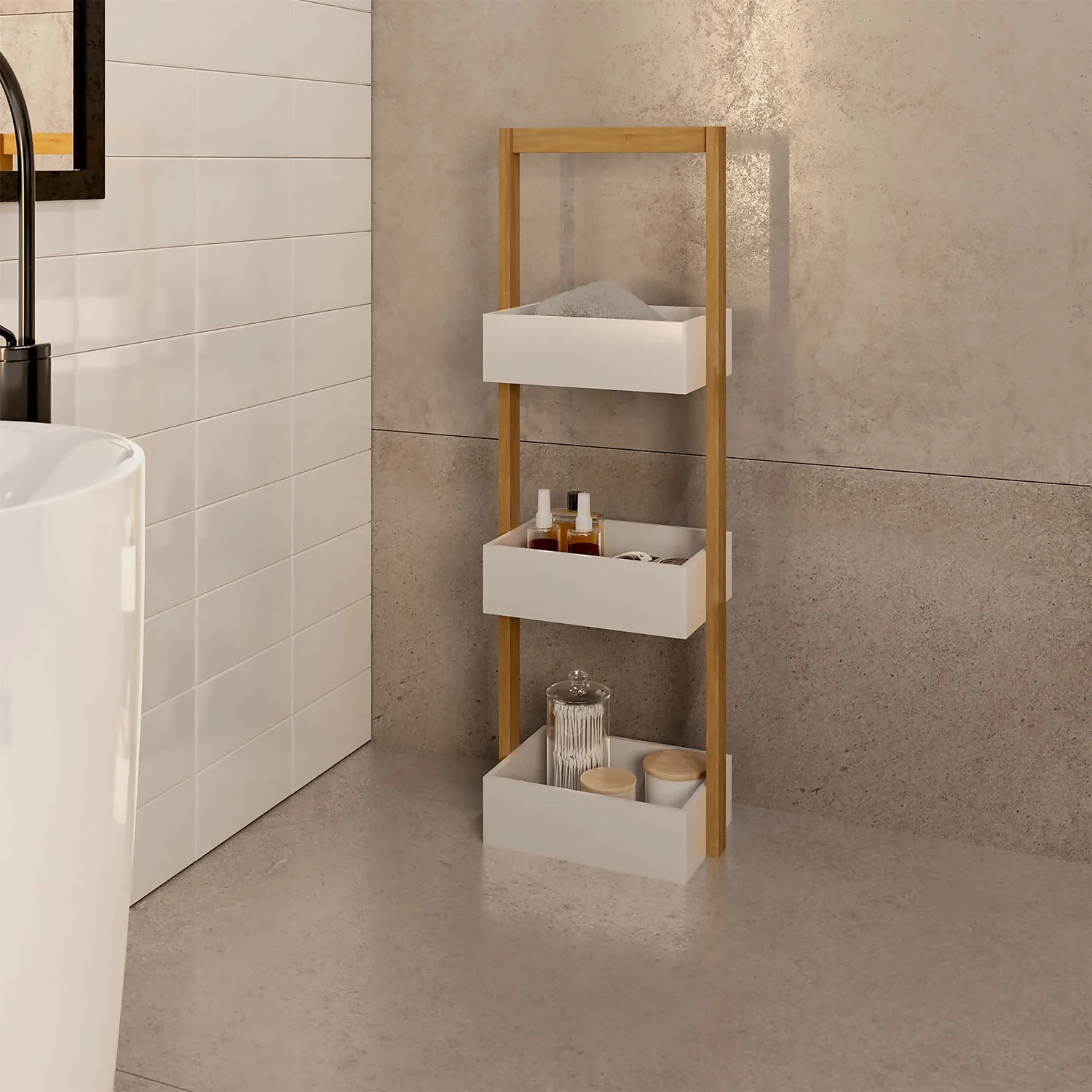 A mix of contemporary and natural, this three-tier storage caddy is a simple storage solution for organising all your bathroom essentials. The lightweight bamboo frame allows for easy movement in your bathroom or laundry room.