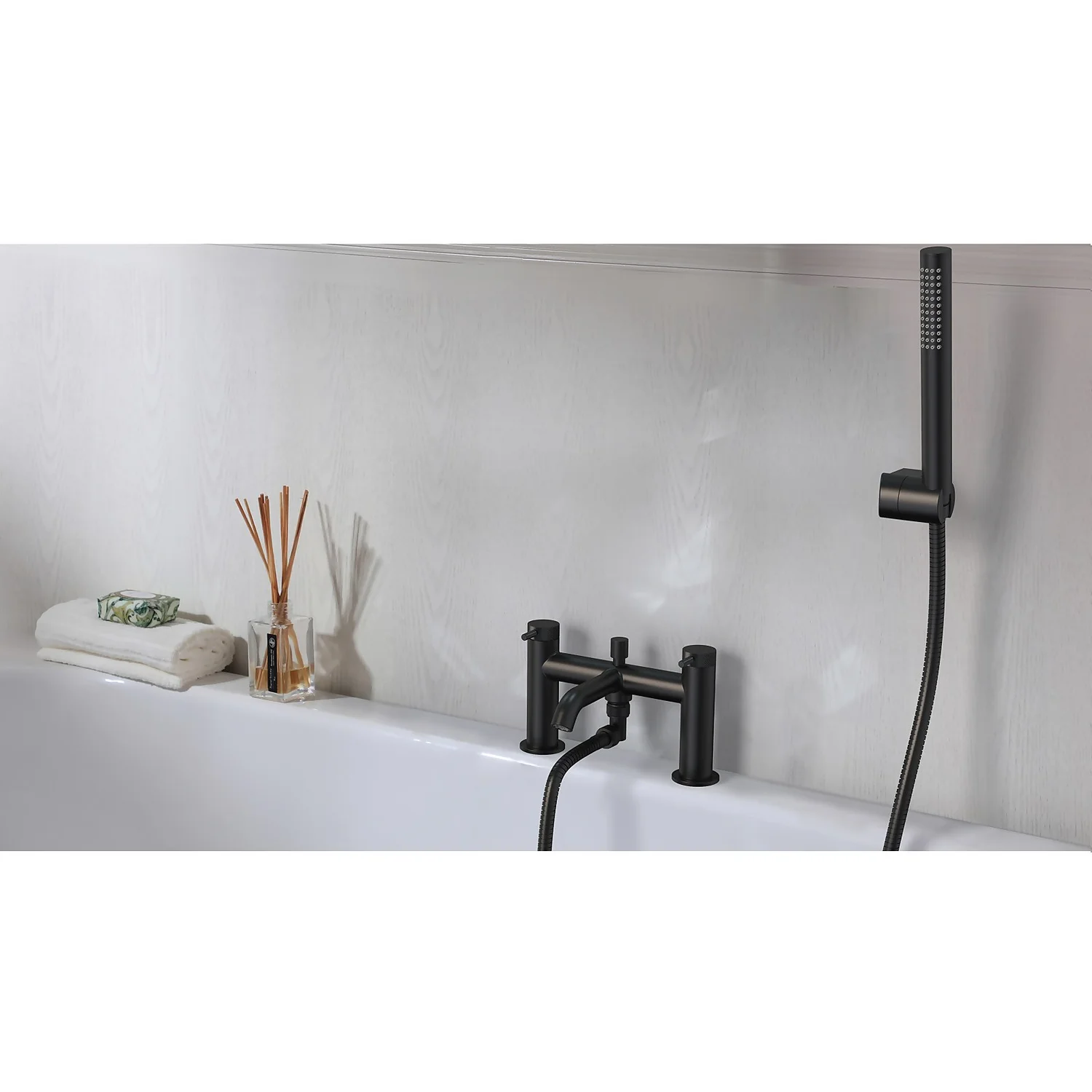 This stylish knurled bath shower mixer is finished in matt black and is complemented by lever handles that give finger tip control of the temperature and flow of water into the bath. Includes the handheld shower head, wall bracket and the flexible hose.