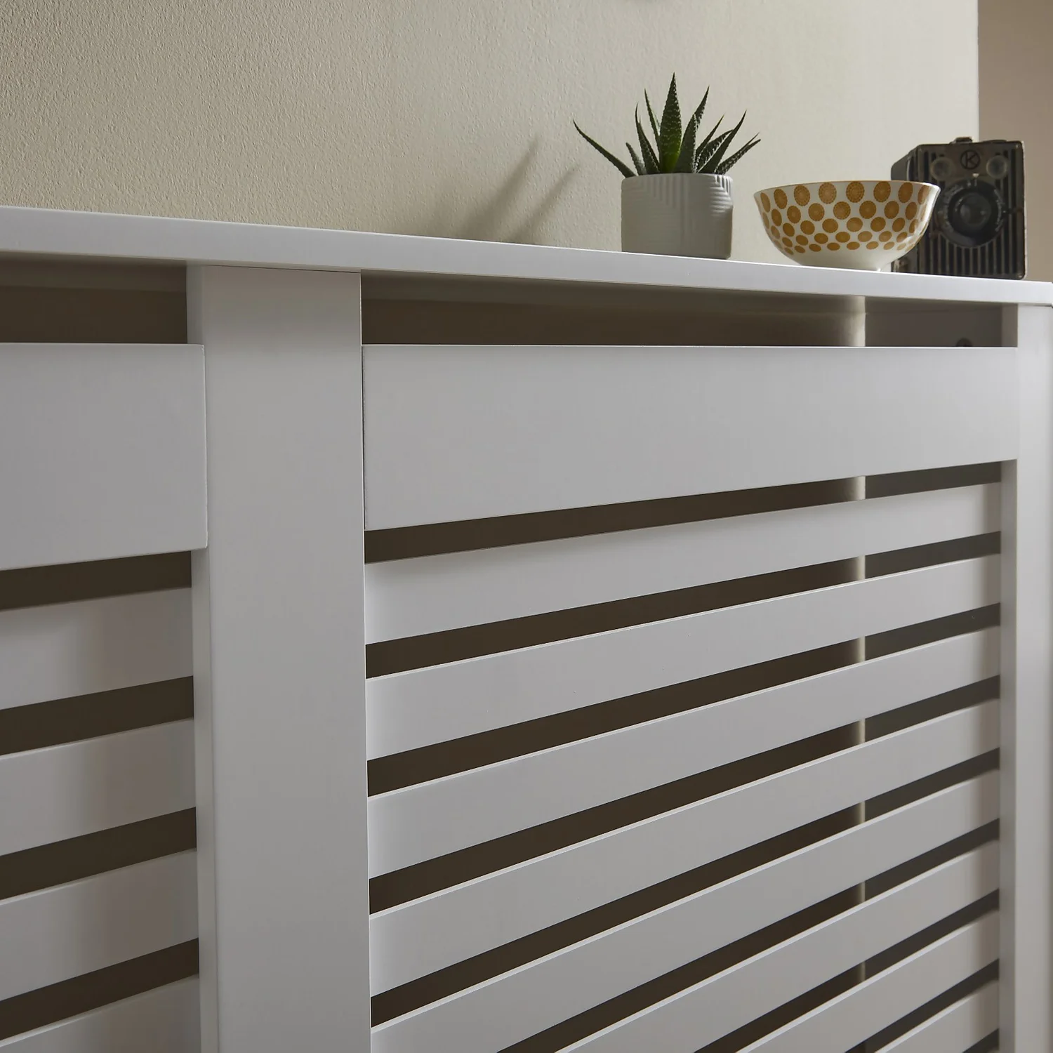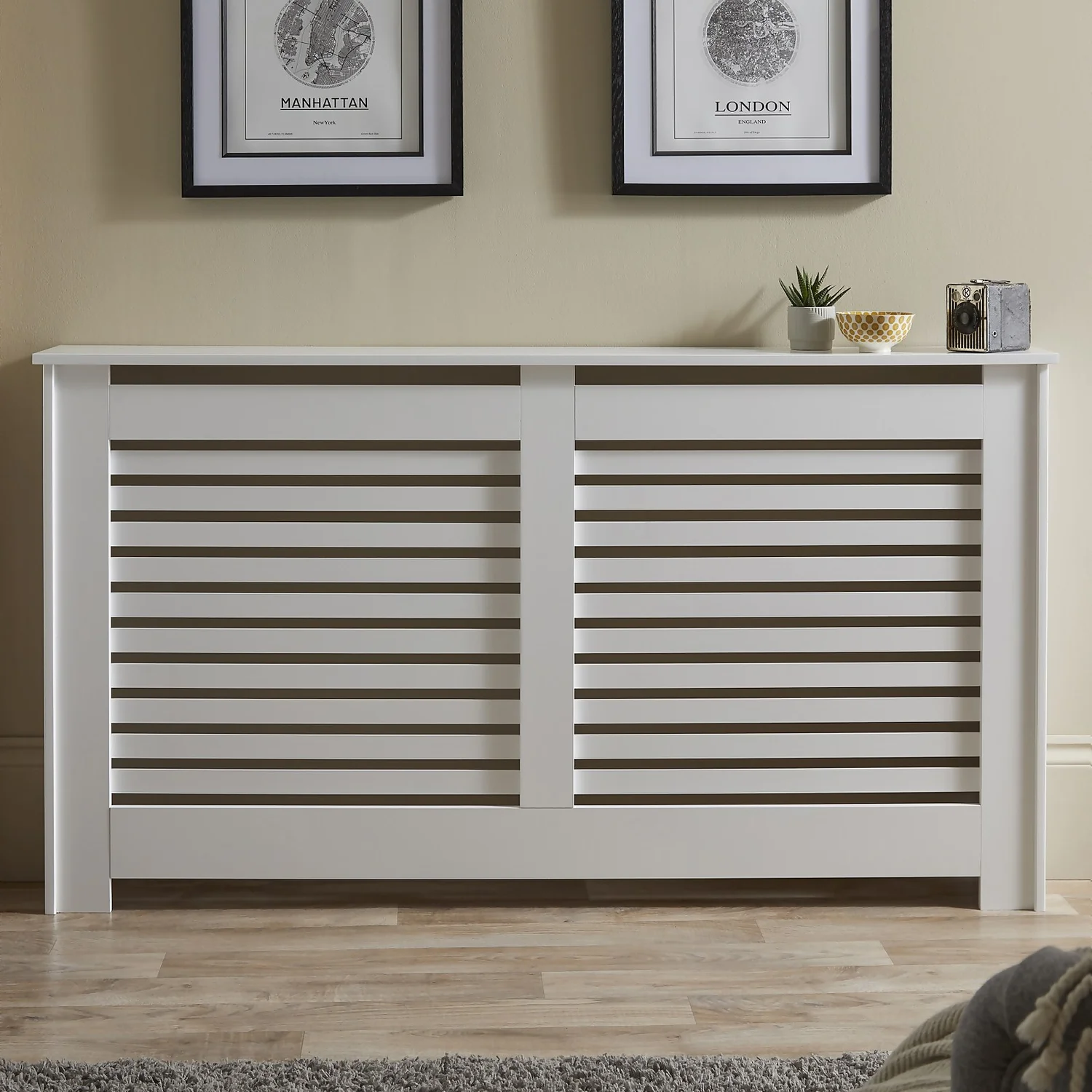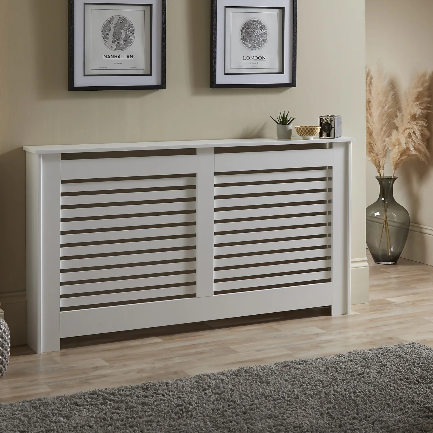 Contemporary Large Radiator Cabinet in White hides radiators whilst adding a shelf to your room. It allows heat to distribute but also prevents children and pets from being burnt. It has a white painted finish with contemporary slatted front and is suitable for any room.