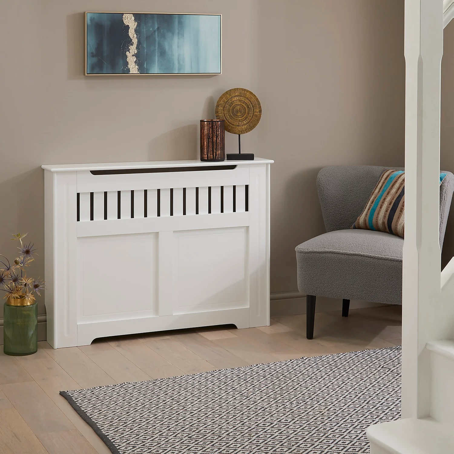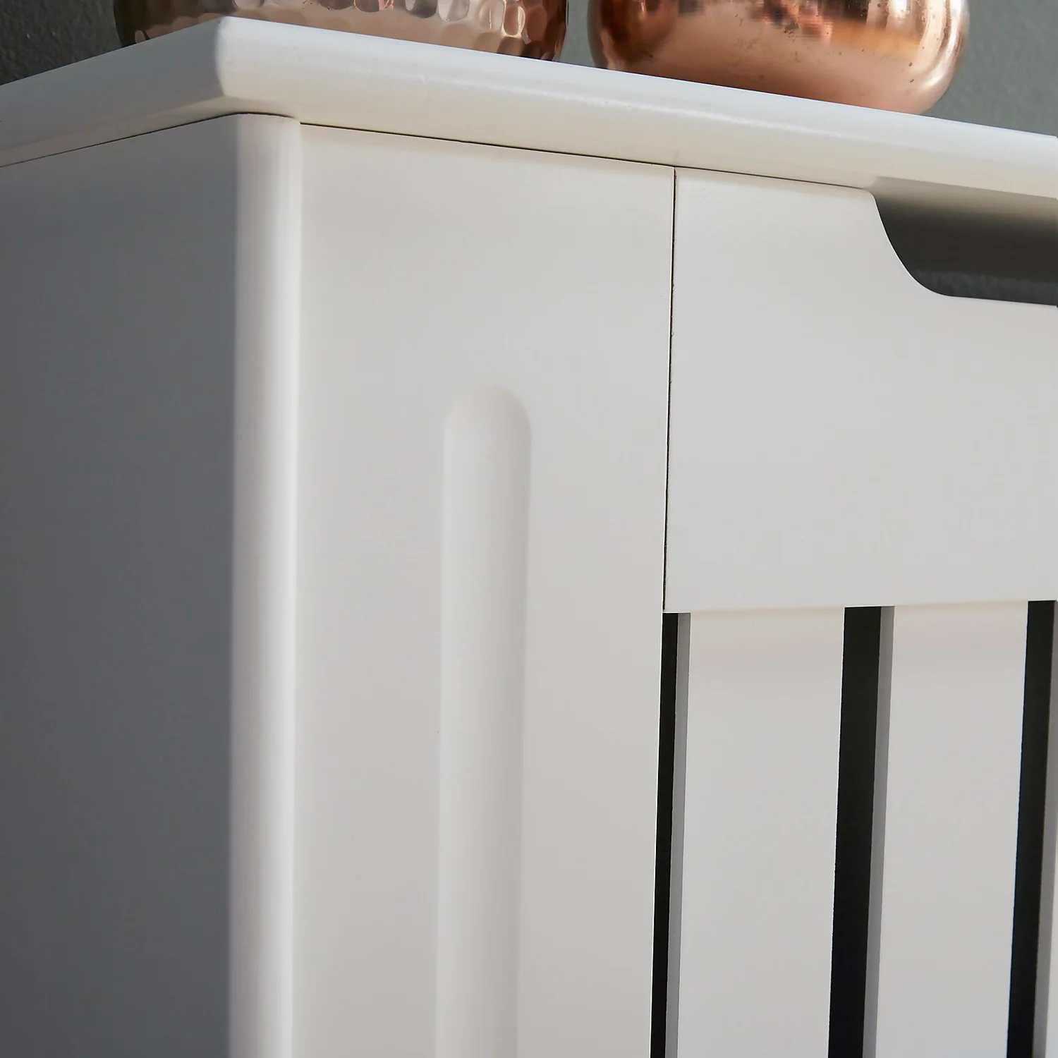 Hide radiators out of sight and add extra shelving to a room with the Shaker Style Radiator Cabinet/Cover. Crafted with a classic groove detail and grill style opening to the top, allowing heat to be distributed easily throughout your home. Finished with a handy shelf to display your accessories, the white radiator cover is a simple way to protect you from accidental burns whilst adding a stylish touch to your home. Available in Mini, Medium and Large sizes.