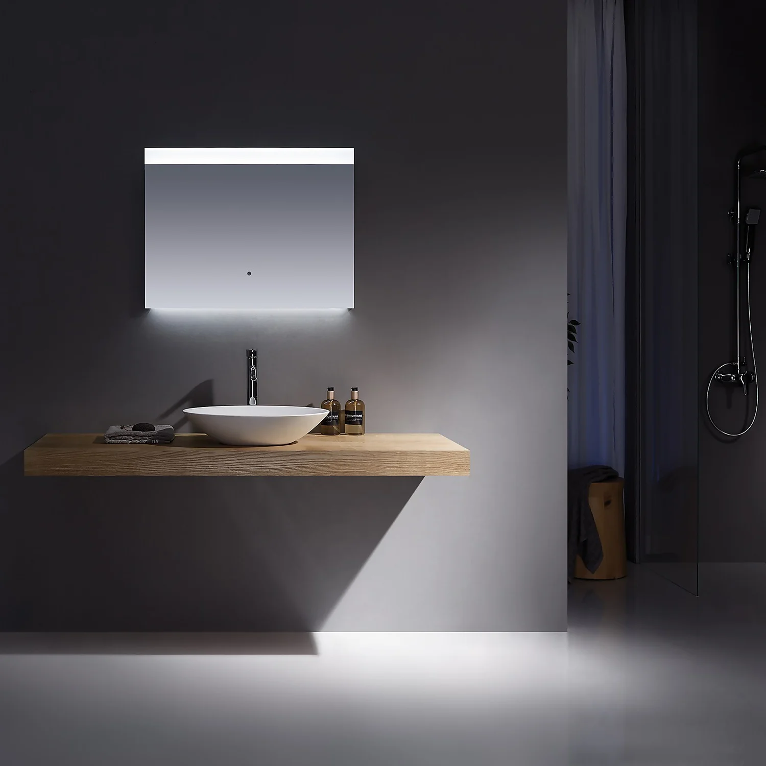 The Tresham Mirror with its ambience and clarity, is infrared controlled with a fully-dimmable top light bar and a soft glow to the basin below.