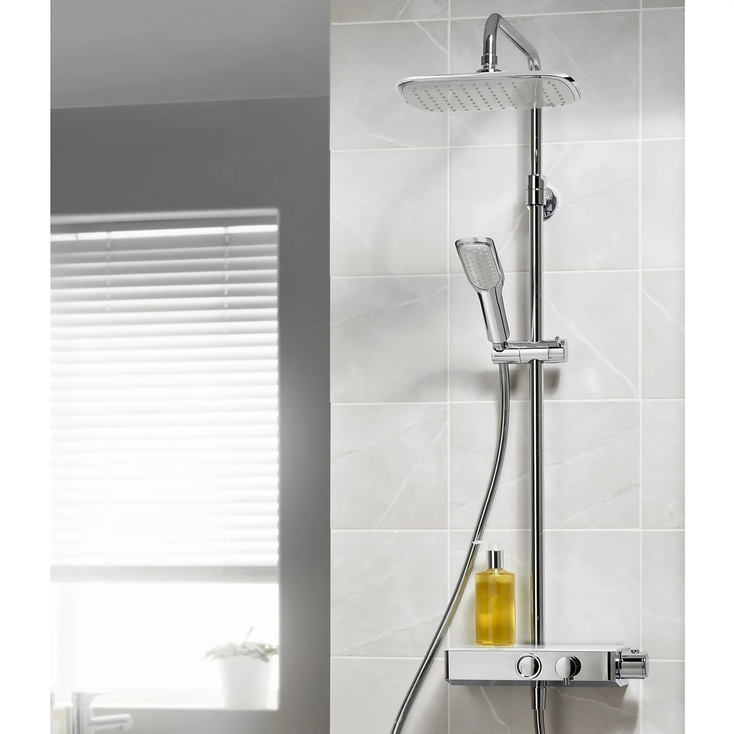 - Includes stylish shelf – ideal for placing shampoo etc.