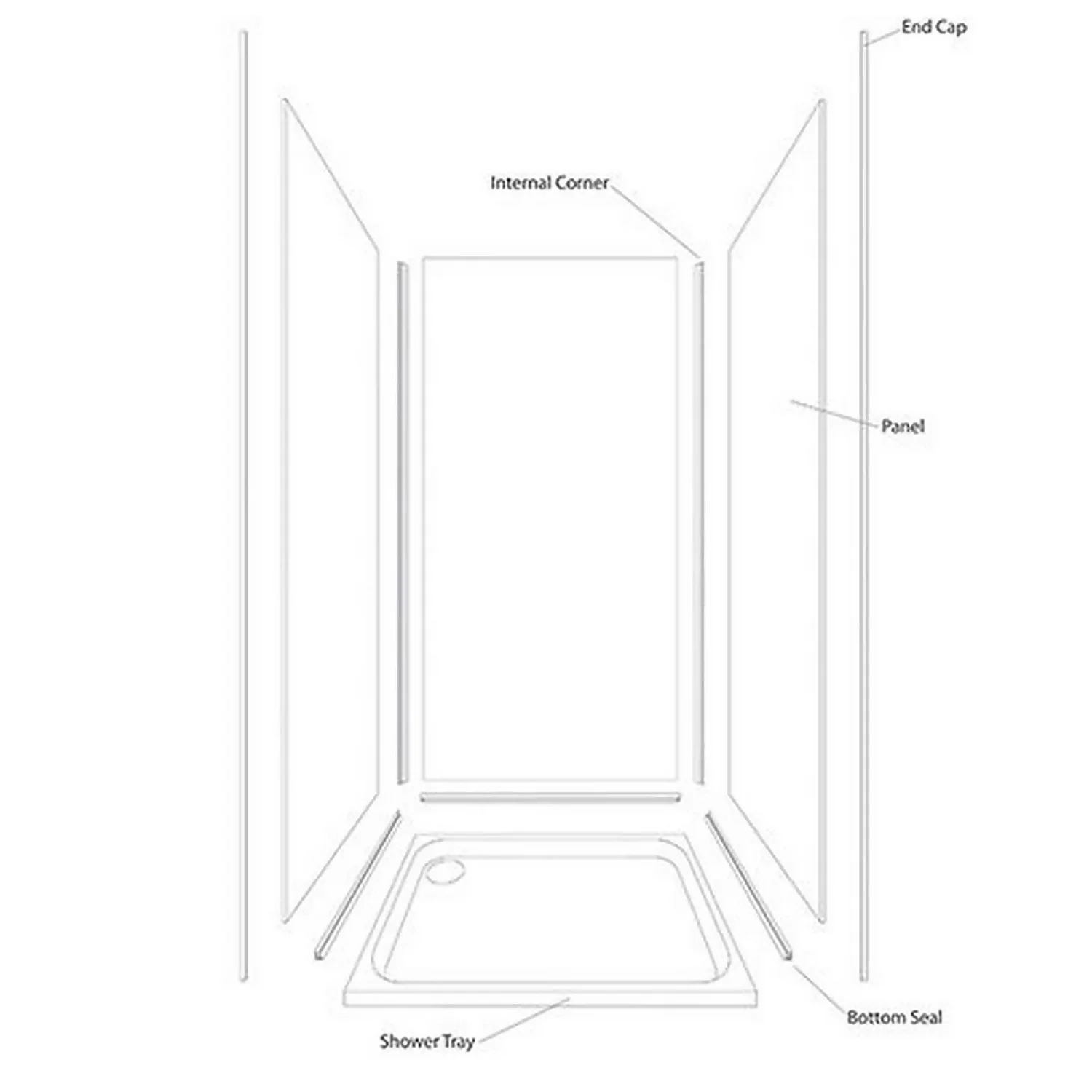 Kit includes: 3 Panels 1200mm wide, 2 Internal corner, 2 End Caps, 2 bottom seal 2 part trim, 3 Adhesive, 3 Silicone, fitting guides and 1 cleaning kit. Shower tray not included.